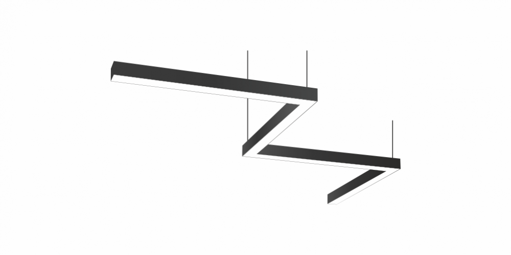 Фигурный светодиодный Светильник Зигзаг LiNE-Pro 4х500mm 40W 5000K черный предназначен для накладного или подвесного монтажа на тросовые подвесы. Изготовлен из сплошного сварного алюминиевого профиля в виде зигзага. Высота установки светильника регулируется подвесом с цанговым тросовым зажимом и может варьироваться от 0,05 метра до 4 метров от основного потолка. Светильник Зигзаг имеет равномерную засветку по всей площади рассеивателя. Источник питания находится внутри корпуса. Торцевые заглушки входят в комплект. Возможно изготовление светильника с магистральной проводкой для соединения нескольких светильников в сплошную конструкцию