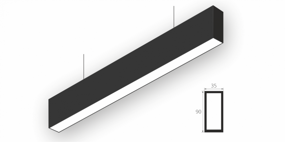 Линейный светодиодный Подвесной светильник LiNE-Pro 90x35 2500mm 50W 5000K Черный предназначен для подвесного монтажа на тросовые подвесы. Изготовлен из алюминиевого профиля длиной 2500 мм, мощностью 50 Вт c цветовой температурой 5000 K, цвет корпуса Черный. Высота установки светильника регулируется подвесом с цанговым тросовым зажимом и может варьироваться от 0,05 метра до 4 метров от основного потолка. Линейный светильник может использоваться для реечных потолков. Светильник имеет равномерную засветку по всей площади рассеивателя. Источник питания находится внутри корпуса. Торцевые заглушки входят в комплект.